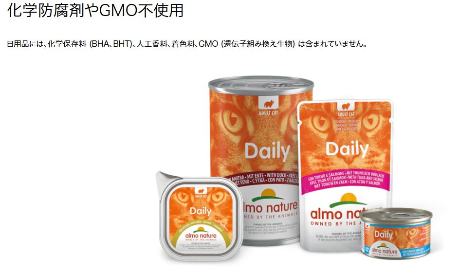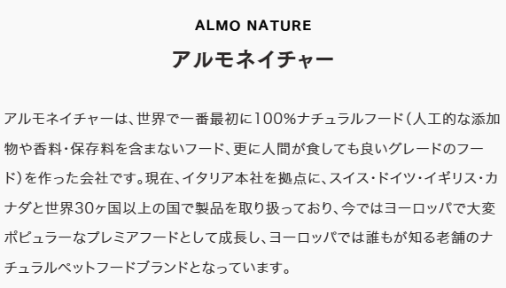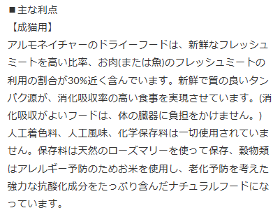 味にうるさいうちの猫が唯一気に入って食べ続けているのがアルモネイチャーです。添加物もなく、栄養価も高くて最高です。
