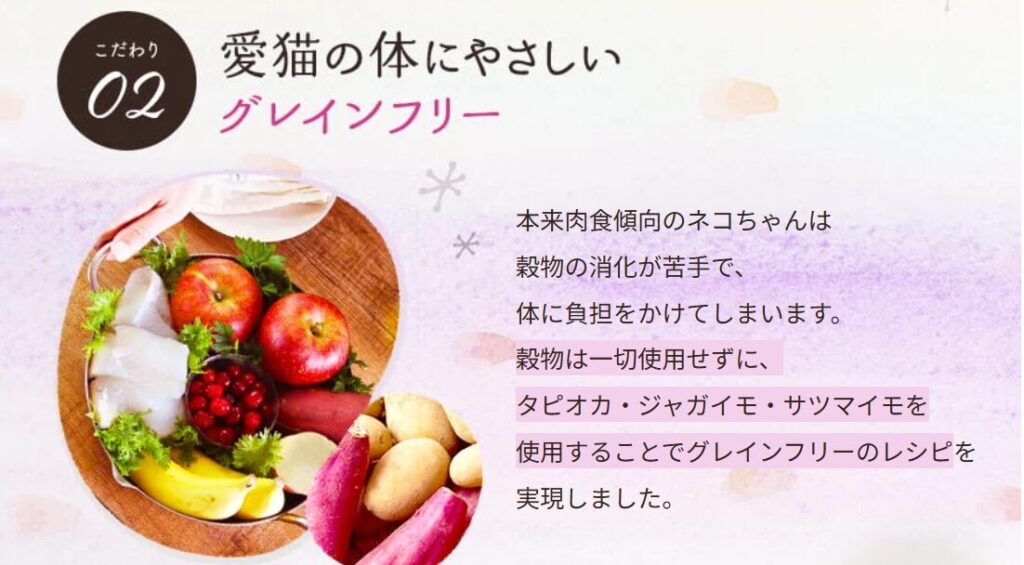 - グレインフリーで消化にやさしく、お腹の弱い猫にも人気