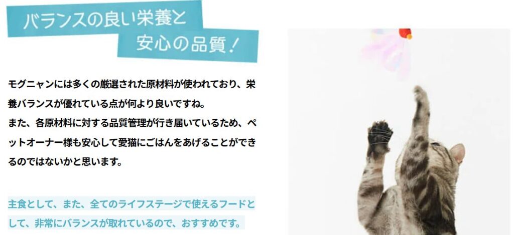 つまり、モグニャンは“誰にでも合う魔法のフード”ではないけれど、「安全性・原材料の質・健康面」で信頼して続ける飼い主が多いフードなんです。