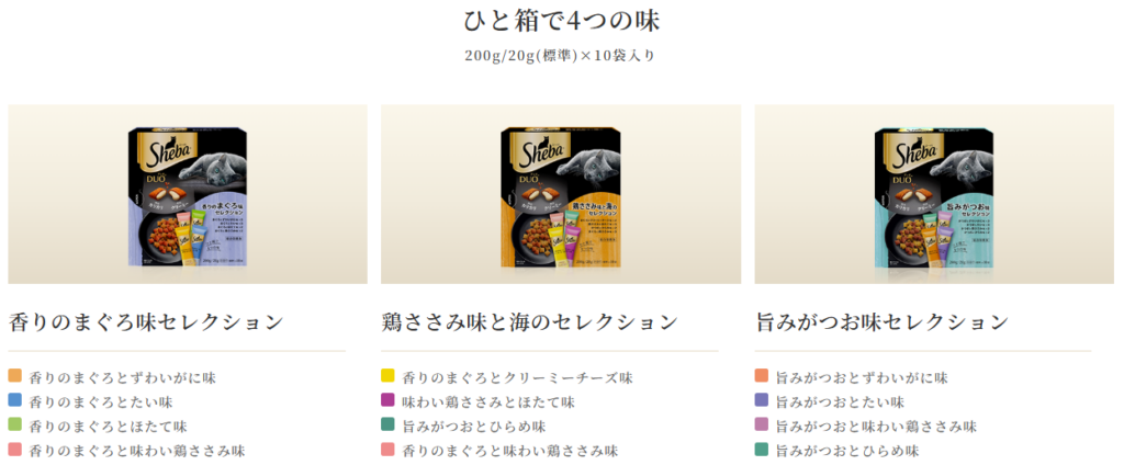 | シーバ デュオ 旨みがつお味セレクション | Sheba | 成猫用 | 猫 | 200g(20g×10袋) | 肉類(チキンミール等)、穀類、魚介類 | タイ | かつお風味を中心にしたバラエティ | 405kcal/100g | 標準〜やや大きめ | 二層粒 |
