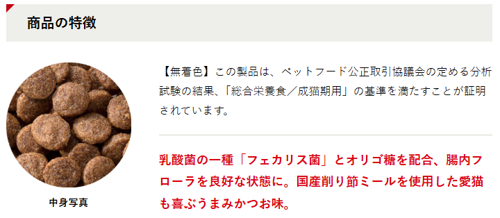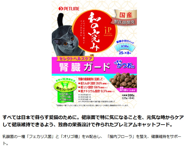 これはいいです。かつおの香ばしい香りが食欲をそそるのか、本当によく食べてくれます。腎臓の悪い猫ちゃんは食事にかなり気を遣いますが、何しろ食べてくれないことには話にならないので、ここまで食いつきがいいというだけで本当にありがたい。