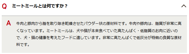 JPスタイル『和の究み』の公式サイトでは、フィッシュミールやミートミール、動物性油脂といった原材料について丁寧な解説がされています。