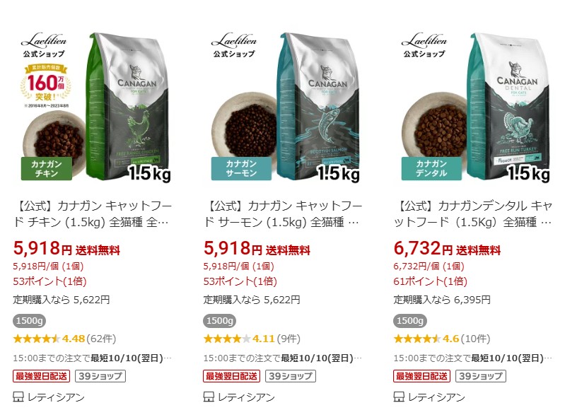 公式サイトでは、全種類のカナガンがラインナップされており、定期購入割引やまとめ買い特典も利用できます。