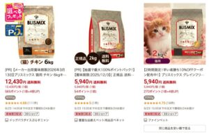たとえば、楽天市場の albiot では “ブリスミックス グレインフリー キャット 2kg” に「ポイント5倍」などの表示がされている例があります。