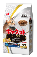 | キャネットチップ お肉とお魚ミックス | ペットライン | 全年齢対応 | 全猫用 | 200g/2.7kg/7kg | 穀類、肉類 | 日本 | 肉×魚のダブルの旨み。偏食ぎみの子にも合いやすい。 | 350kcal/100g | 小粒/I型、Y型 | ★★★☆☆ |