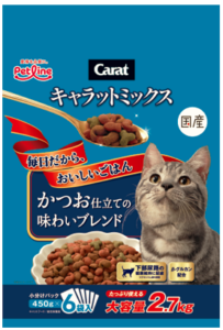 | かつお仕立ての味わいブレンド | Petline | 全年齢対応 | 全猫用 | 2.7kg(450g×6)/4.95kg (450g×11)(コーナン限定) | 穀類、肉類 | 日本 | かつおの旨味を活かした飽きにくいブレンド。香り強めで食いつき良好。 | 335kcal/100g | 中粒 | X型、Y型 | ★★★★☆ |