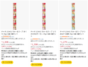 Amazonでは、CIAOちゅ~るスープの主要フレーバーが常に販売されています。
