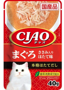 | 総合栄養食 まぐろ ささみ入り ほたて味 | CIAO(いなば) | 全年齢対応 | 全猫用 | 40g | まぐろ、鶏肉(ささみ)、鶏脂、ほたてエキス | 日本 | 総合栄養食仕様で主食として使える。 | 約30kcal/袋 | フレーク | ウェット状 | ★★★★★ |
