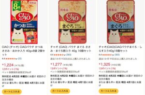 AmazonでもCIAOパウチは問題なく購入できて、人気シリーズはほぼ常に在庫がそろっています。