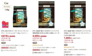 たとえば「ロータス キャット グレインフリー フィッシュレシピ 1.2kg(約4,800円前後)」なら、ポイント還元+クーポン利用で実質4,300円台まで下げられる場合もあります。