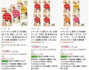 例えば、MediBall 猫用 かつお・まぐろ・ササミ セット はAmazonで取り扱われており、送料無料やプライム対象の出品もあります。