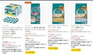 Amazonではピュリナワン公式ストアがあり、「グレインフリー チキン」「白身魚」など幅広く取り扱っています。